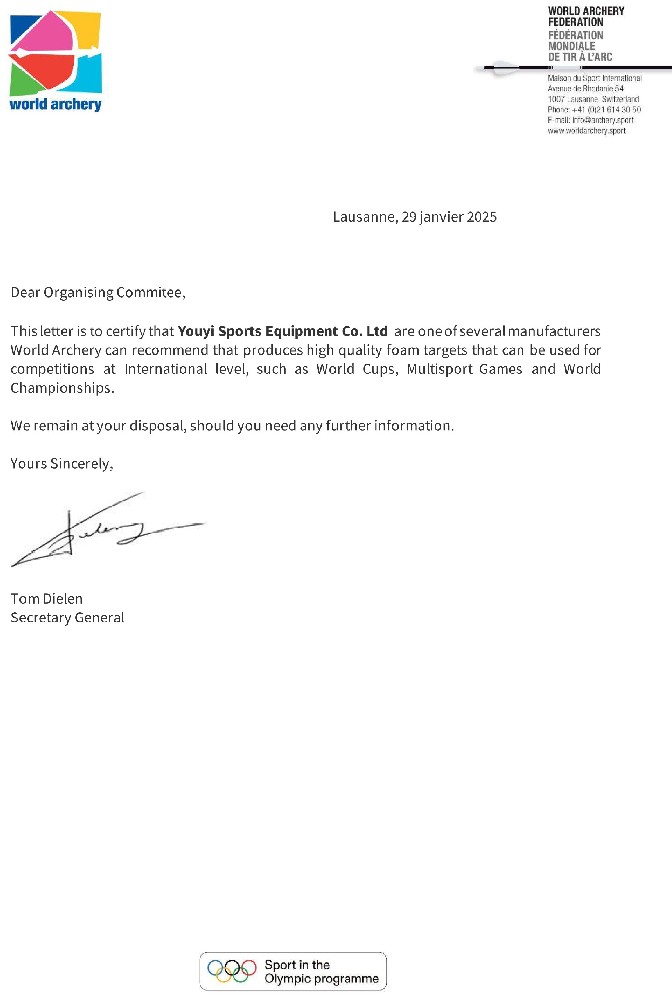 公司自主生產(chǎn)的器材先后成為2008年北京奧運(yùn)會(huì)、2010年廣州亞運(yùn)會(huì)、2011年深圳世界大學(xué)生運(yùn)動(dòng)會(huì)、2014年南京青奧會(huì)、2021年成都世界大學(xué)生運(yùn)動(dòng)會(huì)、2022年杭州亞運(yùn)會(huì)等世界知名賽事射箭器材供應(yīng)商。